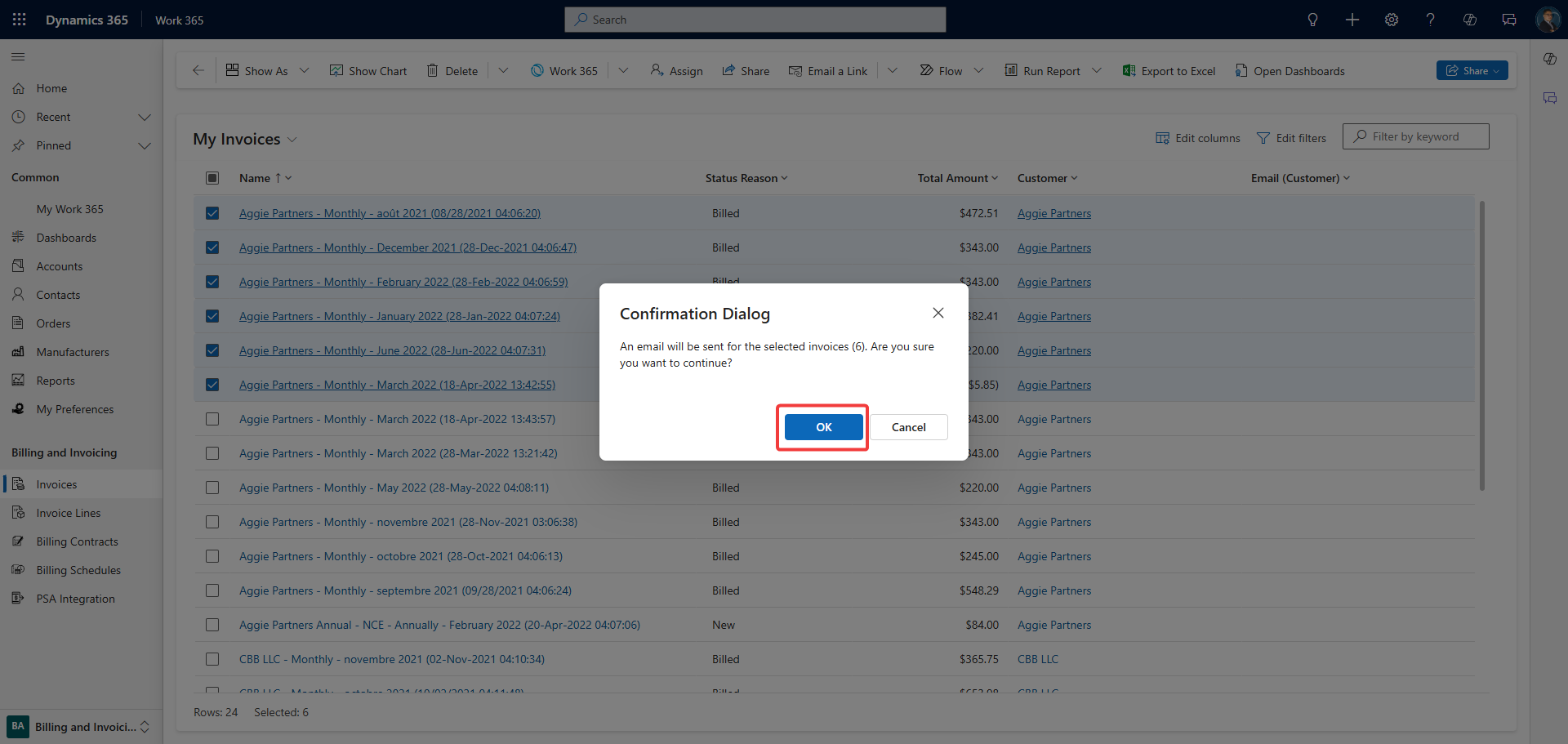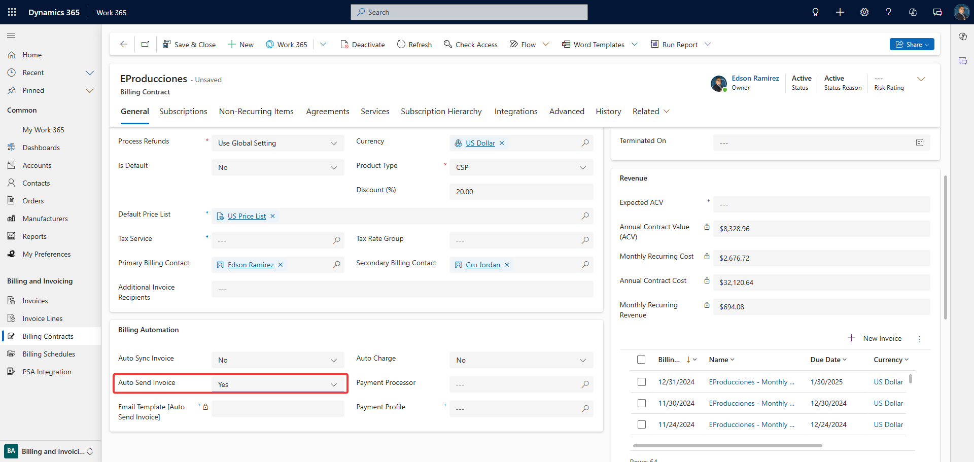 When an invoice is generated for this billing contract, Work 365 will automatically send it to the customer using the redefined email template.