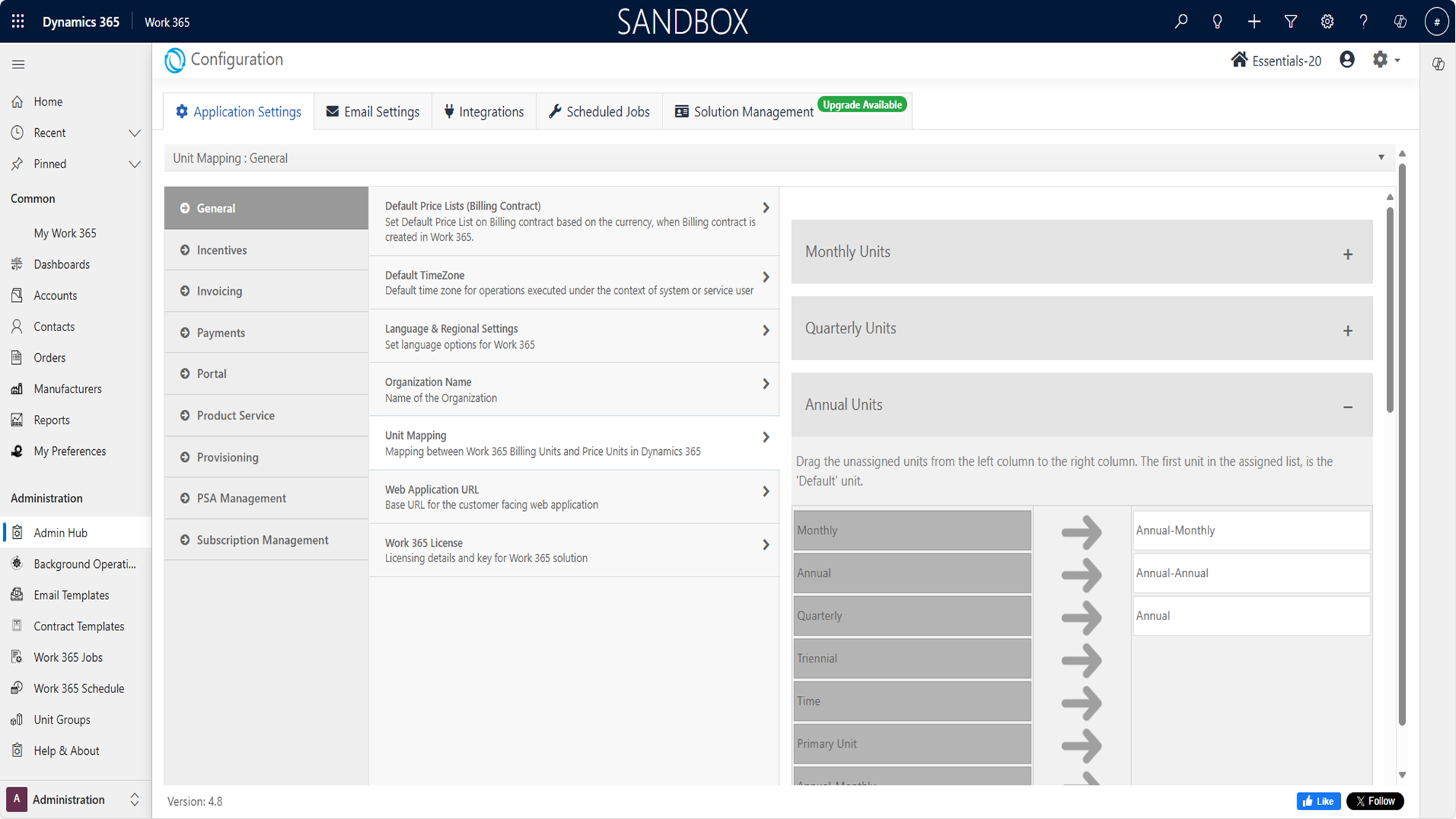 During the initial setup the first install of Work 365 will automatically create the following default sales units which refer to the Commitment Term and the Billing Frequency: